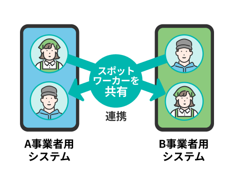 連携設定がされた事業者同士で、登録されたスポットワーカーを共有する(データをそれぞれの固有システムのDBに複製する)システム。