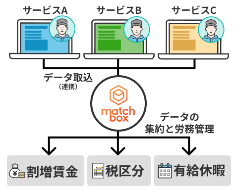 複数のスポットワークサービスの就業情報を取得し、就業者ごとに各種労務状況の判断(割増賃金の支払い条件、所得税の計算区分の変更条件、有給休暇の付与条件のいずれかまたは複数)を行うシステム。